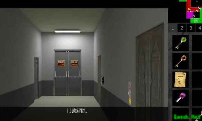 打开右前方反锁的门,进入三楼化学实验室。后退并点击门口,进入三楼电梯间,选择一楼按钮。抵达后走出电梯,进入一楼高一(4)班教室。向左转,解开反锁的门,进入一楼西侧走廊。