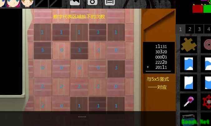 点击天花板的洞口翻越过去,向左转并走近粉红色墙壁。发现墙上有一个5×5的可按动方格,小琪提示可通过点击灯泡查看详细信息。