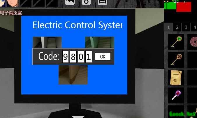 返回二楼电子阅览室,操作左侧电网控制面板,输入密码9801(即99乘以99),解除一楼更衣室走廊的电网封锁。