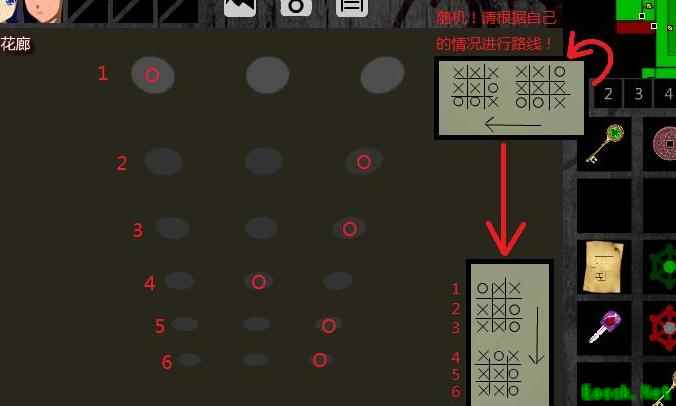使用打开右侧房门后右转,触发剧情并寻找。回忆三层语音室的井字棋布局,将其逆时针旋转90度,O标记处即为正确路径。途中注意及时存档,否则可能进入坠落结局。