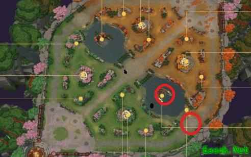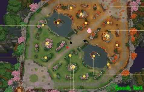 黑点代表奕,红圈为棋盘位置,中路黑点对应石距,石距化作草丛则位于下路。六级后支援无需亲自抵达,神之一手的棋盘机制足以有效协助队友。