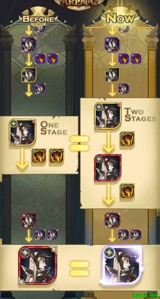 主C英雄的选择在不同阶段有所不同。等级160之前,优先选择火女,将其升至金加即可;其次可选用光女,在前排女仆完全未出现的情况下,可临时使用羊头替代,但随着光耀阵容的流行,羊头已逐渐退出主流。达到160级之后,若女妖、光女或绿剑中任意一位频繁获取,便可重点培养,哪个来得多就用哪个。需要说明的是,女妖强度并非顶尖,但因其获取途径广泛,成为多数玩家的选择,不过仍有部分玩家难以抽到,这种情况下只需将女妖升至金加用于种族塔即可。如果上述核心英雄均未成型,而骨弓或龙弓大量出现,也可考虑使用。骨弓输出能力偏弱,前期和中期表现不佳,不作主推;龙弓则需搭配亚瑟使用,目前亚瑟的半价活动已结束,通过迷宫兑换更具性价比,若直接购买648档位获取亚瑟,相当于花费648元得到7张女妖,单卡成本过高,长期来看对普通玩家并不划算。对于零氪或轻度充值者,主C选择基本局限于女妖与光女,建议以女妖为主,尤其在20章前无法集齐8张其他强势主C时,优先兑换女妖。而对于重度投入玩家,则无需执着于培养女妖,可根据实际情况灵活选择更强力的主C进行发展。