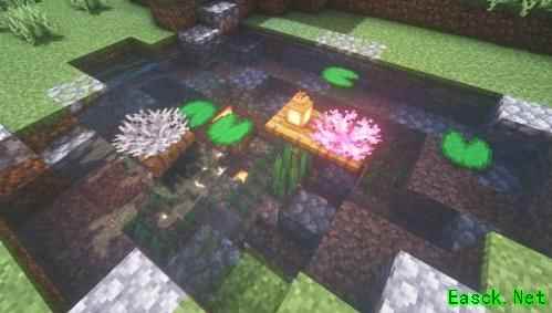 用圆石、苔石及圆石台阶替换池塘内部的方块。