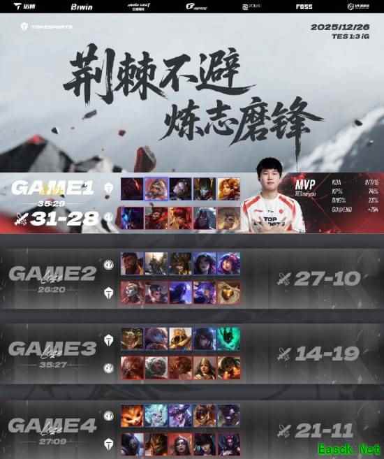 在昨日进行的《英雄联盟》德玛西亚杯淘汰赛中,滔搏电子竞技俱乐部TES以1:3不敌IG。