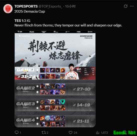 不过,比失利更尴尬的事情出现在赛后。TES的海外运营推特账号在发布比赛战报时闹出乌龙,竟然将本场对手IG错写成了 GEN。尽管官方随后迅速修改为正确队名,但这一低级失误还是被不少网友截图留证,引发吐槽,直言运营“太不上心”“草台班子”。