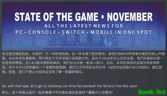 文中还向玩家表达了圣诞快乐的祝福,并且解释了为什么没能在12月发布,简单地说就是员工要过圣诞,因此时间安排不过来!