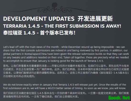 文中提到:我们目前还无法确定泰拉瑞亚1.4.5版本会在一月份的哪个时间发布,一旦有结果会立刻通知大家。