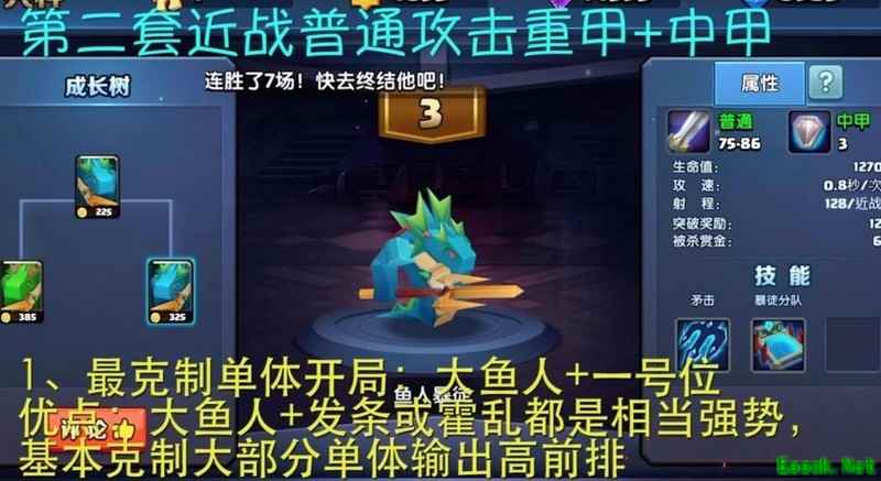 缺点在于,敌方见到你选择大鱼人,通常会安排三名以上一号位英雄分散站位,以规避你的控制技能。因此需搭配闪电链来有效清理分散的单位。此外,大鱼人开局虽强,但后期作用大幅下降,必须提前制定应对策略。开局阶段不宜过多投入兵力,避免资源浪费。