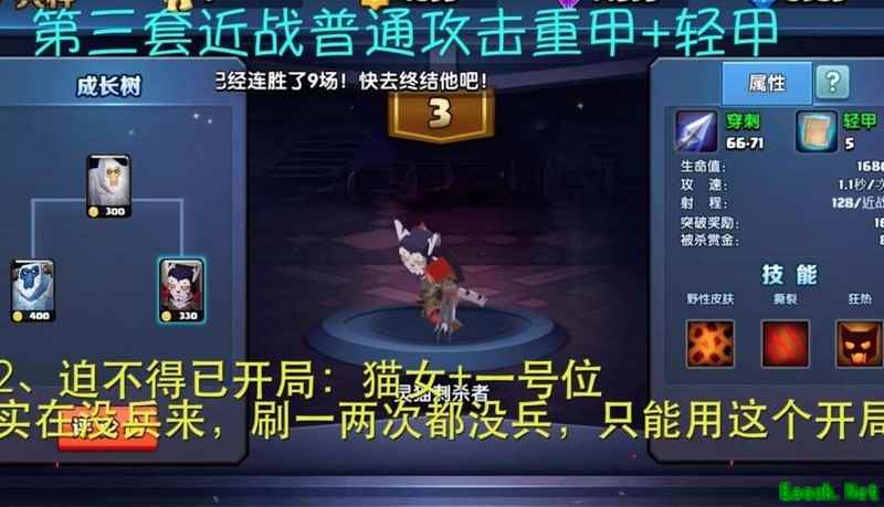 迫不得已时可选用猫女加一号位开局,若多次刷新仍无士兵可用,只能如此。但因缺乏穿刺符文,输出能力一般,整体稳定性较差,故不推荐此开局方式。