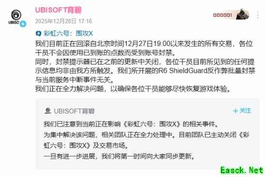我们目前正在回滚自北京时间12月27日19:00以来发生的所有交易,各位干员不会因使用已到账的点数而受到账号封禁。