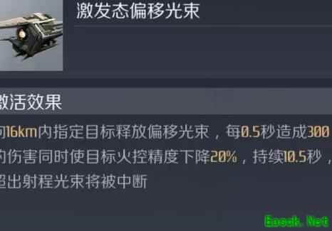 超级装置可在16公里范围内对指定目标发射偏移光束,每0.5秒造成300点伤害,并使其火控精度降低20%,效果持续10.5秒,超出射程则光束中断。