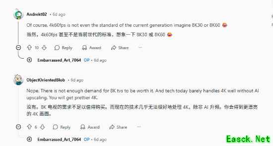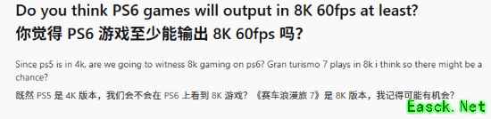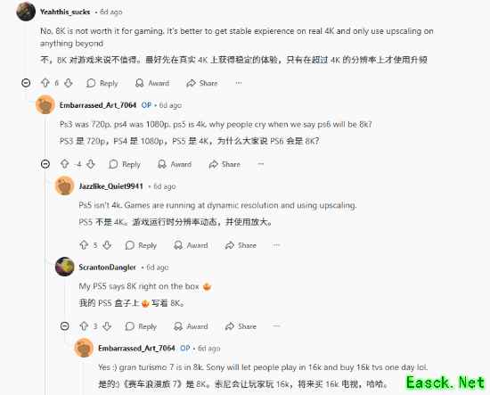 在 Reddit 论坛的 PS6 专区,用户 Embarrassed_Art_7064 发布帖子,对索尼下一代主机的规格参数提出了疑问,尤其聚焦在分辨率方面。在他看来,考虑到 PS5 本身支持 4K 分辨率,甚至能在《跑车浪漫旅 7》中实现 8K 输出,那么 PS6 未来很有可能实现所有游戏 8K 分辨率、60 帧运行的目标。这一猜想引发了其他用户的热议,无论这一观点是否纯属故意引战,不少网友都在评论区里纷纷留言,试图让 Embarrassed_Art_7064 回归理性。