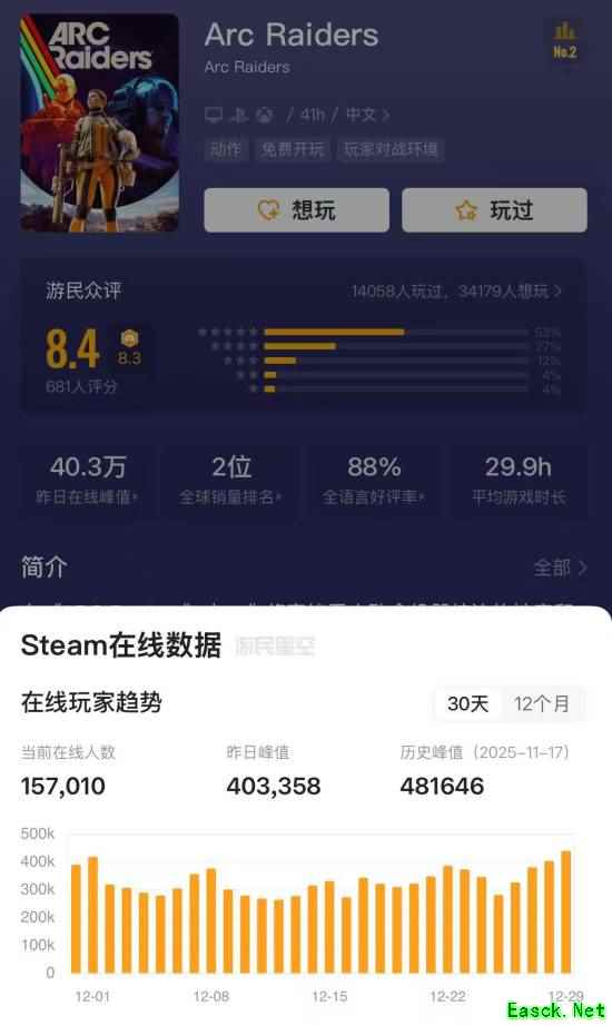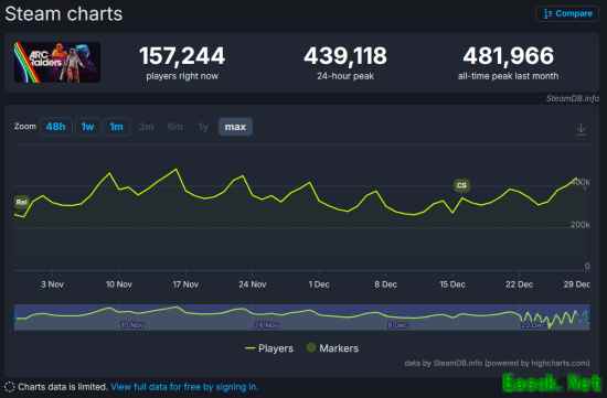 在刚刚结束不久的TGA上,由Embark Studios打造的《Arc Raiders》斩获了年度最佳多人游戏。根据Steamdb数据显示,游戏在11月16日创下481966人的最高同时在线后,时至今日,仍维持着超高的热度,留存了几乎90%的玩家。