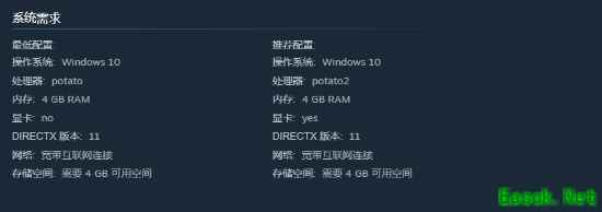 官方标注的系统需求也极为草率,处理器要求为“potato”,显卡也标注为no和yes。