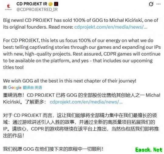 交易完成后,CD Projekt与GOG签署了新的发行协议,未来CD Projekt Red(CDPR)旗下的新游戏仍将在GOG平台同步发售。CD Projekt联席首席执行官米哈尔·诺瓦科夫斯基(Micha? Nowakowski)表示,GOG拥有一个雄心勃勃的发展路线图,专注于引入新的高品质产品。他称:“GOG已独立运营很长时间,如今它将回到非常可靠的创始人手中。我们相信,在联合创始人米哈尔·基钦斯基的支持下,它的未来将充满出色的项目和成功。”