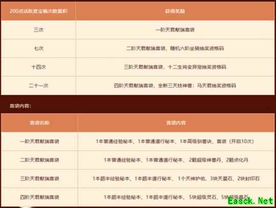 累积开启200点活跃度宝箱次数达到3/7/14/21次的玩家可以前往活动大使处领取对应阶位的“天君献瑞喜袋”奖励。