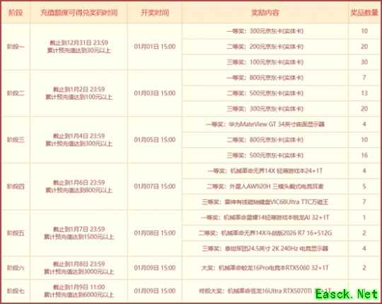 2025年12月29日开启预充值后-2026年01月09日11:00期间,在“2026”服务器进行预充值,累计充值额达到相应的额度即可获得一个抽奖资格码来参与抽奖活动。累积预充值额度越高可参与抽奖的次数越多,奖池内的奖励也就越丰厚!