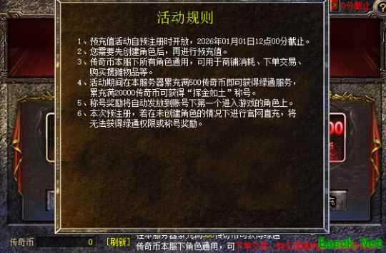 【活动一:新服“预充值”尊享绿通服务】预充值时间:12月24日中午12:00起至2026年1月1日中午12:00(活动限时!)参与区服:三区 流星[散人专区]友情提示:参加活动前,需要将客户端更新至最新版本。更新步骤:请先关闭客户端及登录器,再重开登录器,将游戏更新至最新版本。只有最新版本才能显示正确的绿通活动参与条件(即本服预充值满500传奇币);如未更新,可能出现异常显示。