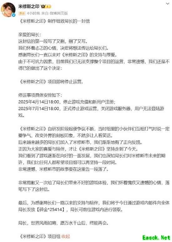 官方在公告中表示,由于游戏的运营状况难以支撑后续的研发和运营成本,已无法为导演们提供更好的服务体验。经项目组慎重评估,非常遗憾地宣布:《归龙潮》将于2025年12月10日10:00正式停止运营。