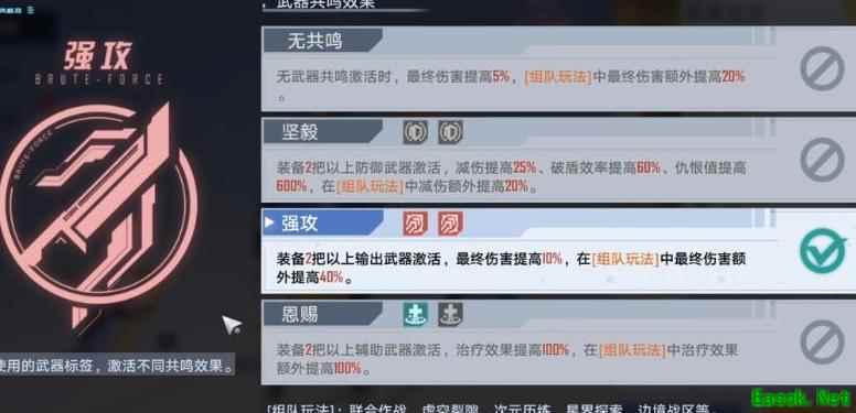 每位角色可同时携带三件武器,依据武器类型分为攻击、防御与辅助三类。当装备两件相同类型的武器时,将激活对应的武器共鸣效果:双防御提升减伤能力,双攻击增强最终伤害,双辅助则强化治疗效果。