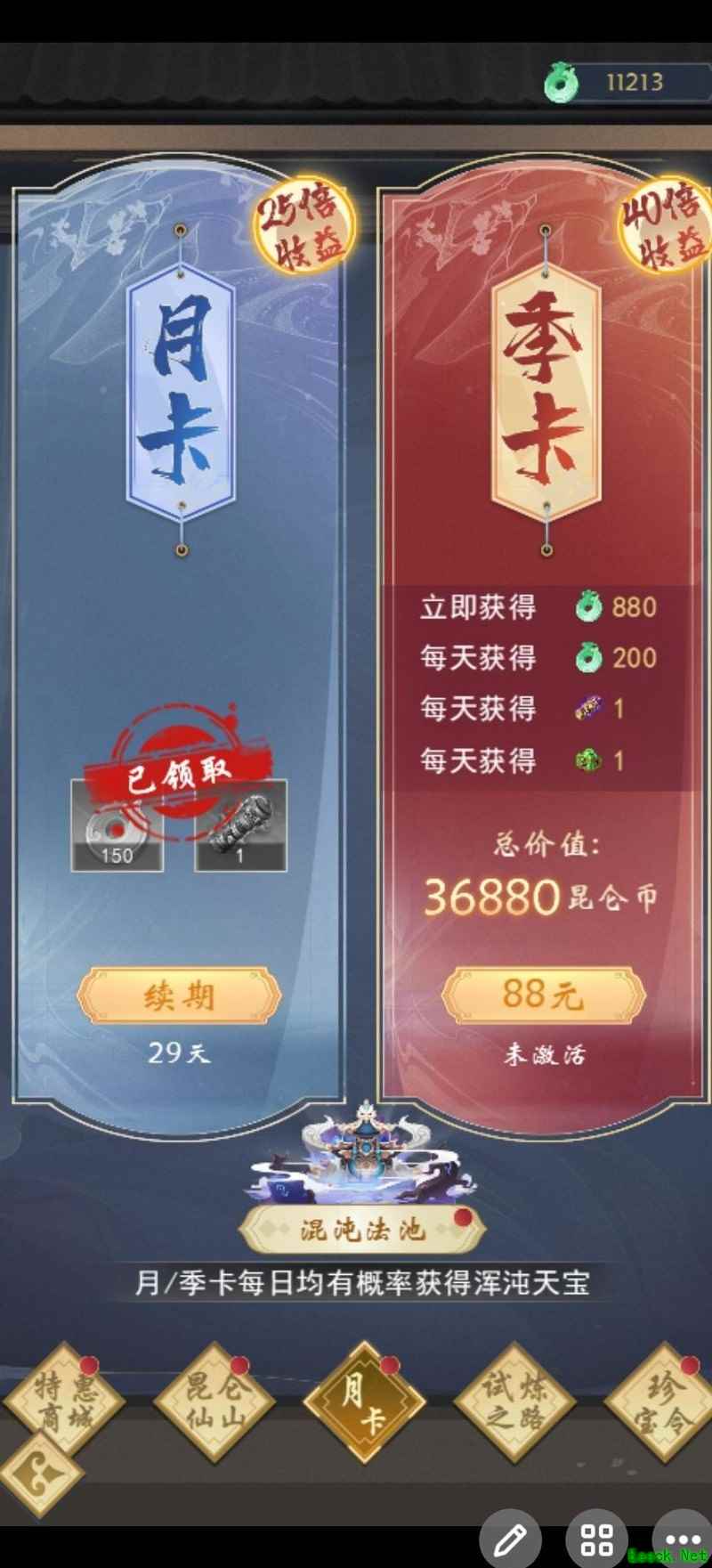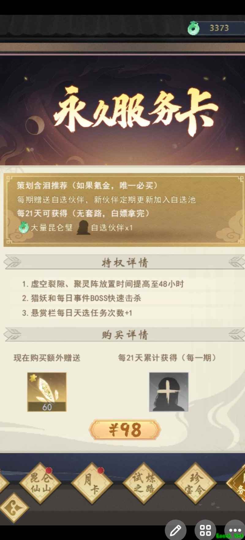 试炼之路与月卡等同,优于乱古飞升礼,更胜尊者、君子及罗盘。