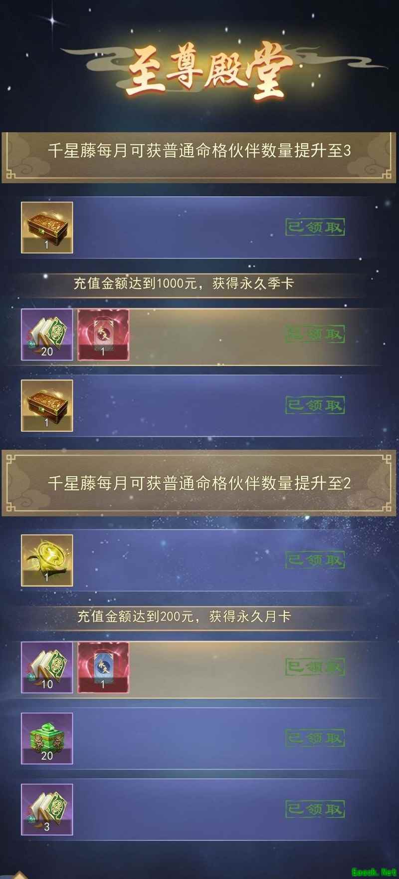我推荐200元档位,最大优势是可永久免费获得月卡,永久福利岂不更划算?