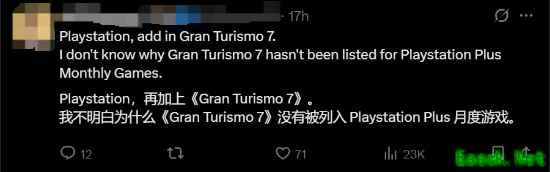 也有网友对《GT7》未被列入会免阵容表示失望,甚至直接向索尼喊话,希望未来能将这款经典赛车游戏纳入名单。