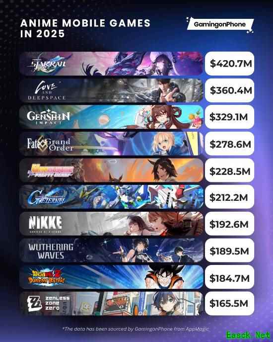 国外移动游戏媒体GamingonPhone公布了2025年收入最高的10款二次元游戏,数据来源于App分析平台AppMagic。米哈游的《崩坏:星穹铁道》遥遥领先,一起来看看排名吧。