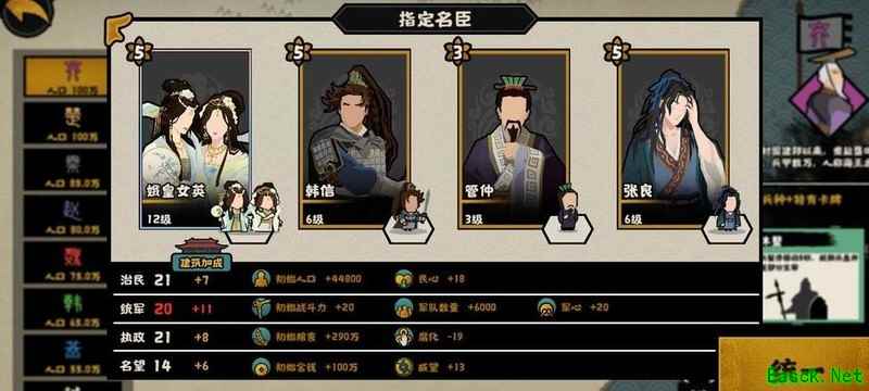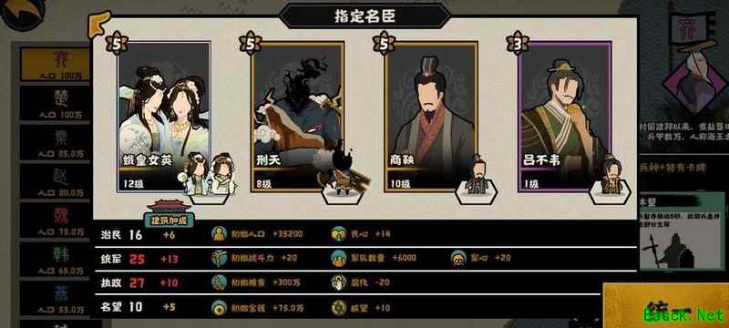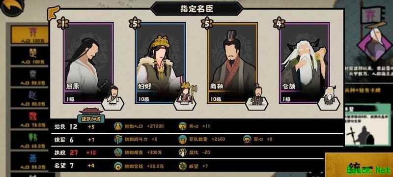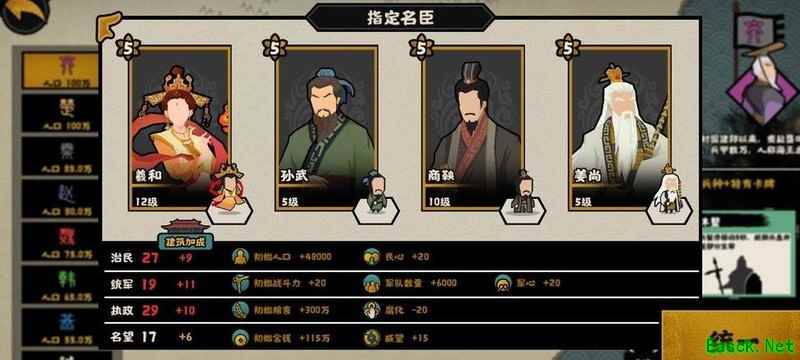 民生属性可换取巴青,军事方面可选择蛮巫或风后,政治推荐伊尹,其五星可提升35%规模,但要求腐化率低于10,若未招募降低腐化的名臣,建议慎用。