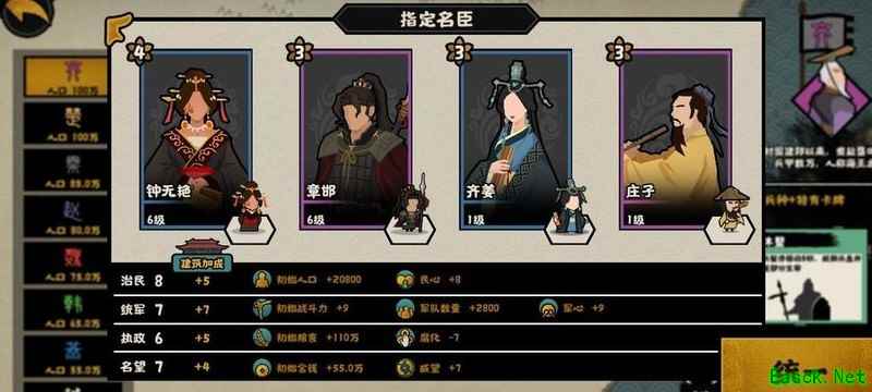 军事方面可考虑替换吴起,但不建议用孔子替代,因其一技能会降低商鞅好感并增加腐化,且比干会减少威望,难以积攒至80点触发三技能效果。