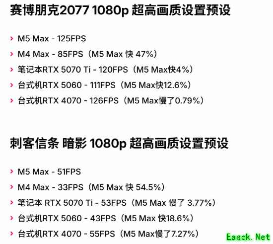 Reddit网友Cheap-Ability9453花时间提供了各种英伟达台式机和笔记本电脑GPU的性能对比,并将这些芯片与M4 Max以及苹果即将推出的M5 Max进行了比较。测试了两款游戏:《赛博朋克2077》和《刺客信条:影》,分辨率设置为1080p,画质预设为超高。