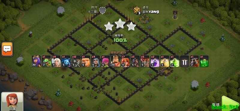 先令天女从六点方向进攻九点位置,释放防空火箭减轻狗球压力。随后由男王搭配女武神,携带弹跳与狂暴治疗法术,突入空中核心区域,清除连弩附近的吹风机,确保狗球安全进场。紧接着投放野猪骑士攻击三个格子目标,再释放狗球部队,结合 surviving units 与剩余野猪,彻底摧毁上方防御体系。