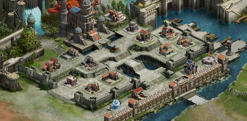 游戏里每个元素都是精心描绘的,王国的每一寸土地都显得生机勃勃,其中,场景部分,美术大大们就进行了大范围的修改和优化,例如这张龙裔主城的地图就进行了不同程度的修改和优化,其中主堡建筑也做了重新的设计和制作。