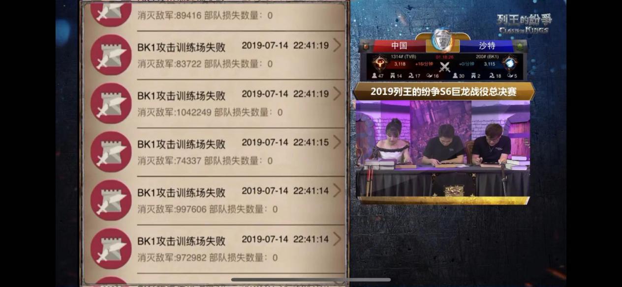 比赛进行到最后1小时,TVB(1314)拿回主建筑的掌控权,战场走向开始由中国队伍掌控。沙特联盟BK1(200)在努力对主建筑进行4-5波集结部队冲击的情况下,中国联盟TVB(1314)都会在对方占据建筑后的1-3秒内再次反集结,使对手的多次进攻无果。双方你来我往,将SLG电竞的魅力:手速、操作、执行力、决策等,展现的淋漓尽致。超过10次的尝试后,由于效果不佳,本场比赛的主动权被TVB(1314)把握手中,比赛差距开始拉开,超过1000分。