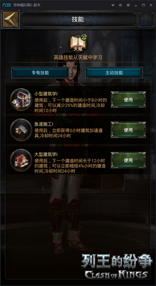 英雄特性:提高城市建设速度,降低城市建设消耗。学习专属技能可获得加速道具,缩短建造所需时间。