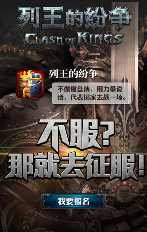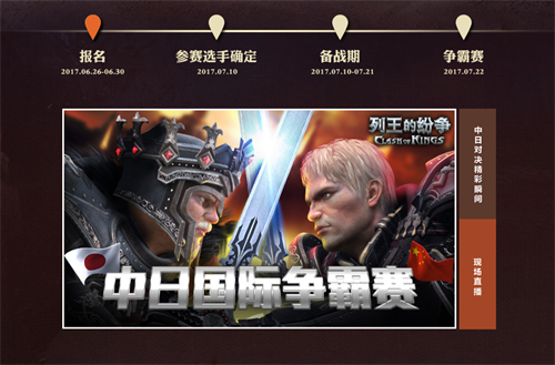 7月22日,全球聚焦的COK中日大战即将爆发,两国最顶尖的选手将联袂献上一场精彩绝伦的对决。国家战队集结行动正在火热进行,关注微信公众号liewangdfz,在H5页面报名参战或者为英雄们助威,这一次,祖国需要更多英雄。精彩赛事,快乐升级,《列王的纷争》带你走进宏大而精彩的战略大世界!