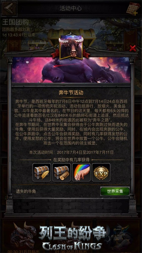 除了精彩的比赛值得期待之外,游戏中众多新玩法的加入同样令快乐再度升级。游戏推出全新“奔牛节活动”,通过采集资源获得牛角,并捕获“发怒的公牛”,就可以在敌人的城堡旁边将其释放,让敌人见识到公牛的愤怒!还有浪漫的“全服鲜花排行榜”,你可以为其他王国的好友赠送鲜花,还可以在王国聊天频道为自己或其他领主拉票,更好玩的互动让你表达无尽爱意。更有全新的套装、科技和龙语即将登场,更多精彩马上到来。