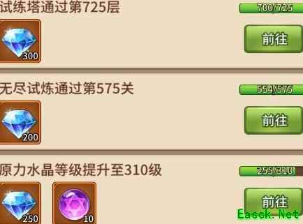 完成试练塔挑战、提升原力水晶等级、通关无尽试炼与元素圣殿等关键成就,均可获得钻石奖励。