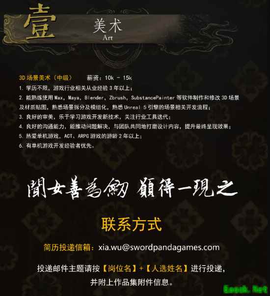 《猿公剑》由成都剑猫熊网络科技开发,该团队专注于单机游戏的制作,其核心成员拥有十分深厚的开发经验与技术积累。本次公开招募3D场景美术(中级),薪资1-1.5万。