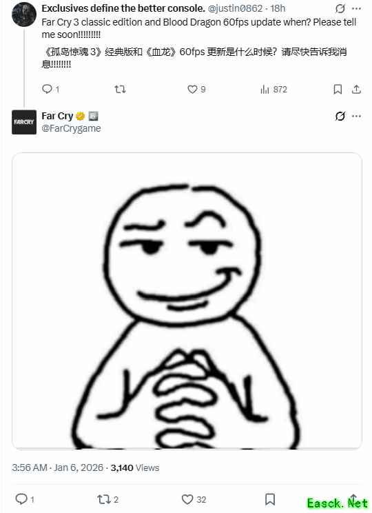 在育碧的一条动态下,玩家@justin0862喊话:“《孤岛惊魂3》经典版和《孤岛惊魂3:血龙》什么时候才能推出60帧更新?请尽快回复我!!!!!!”而《孤岛惊魂》官方账号并没有回复文字,而是立刻回复了一个神秘表情包。