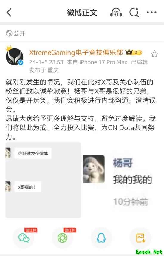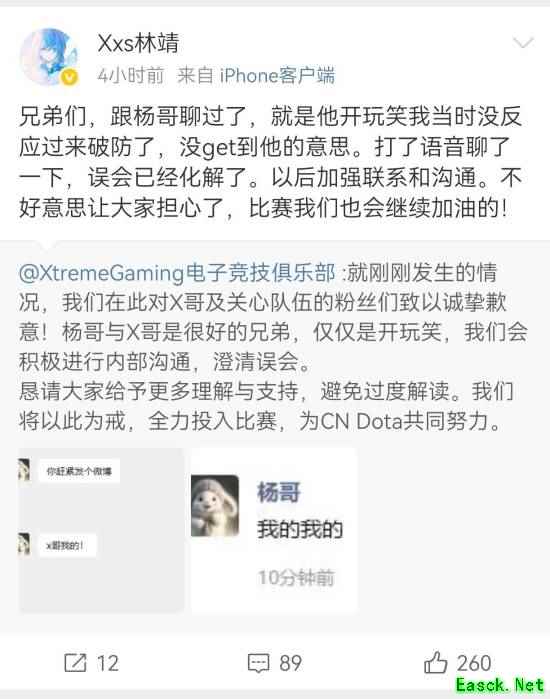 XXS本人也发微博表示当时没GET到杨哥在开玩笑破防了,二人在打完语音电话后已经和解了。