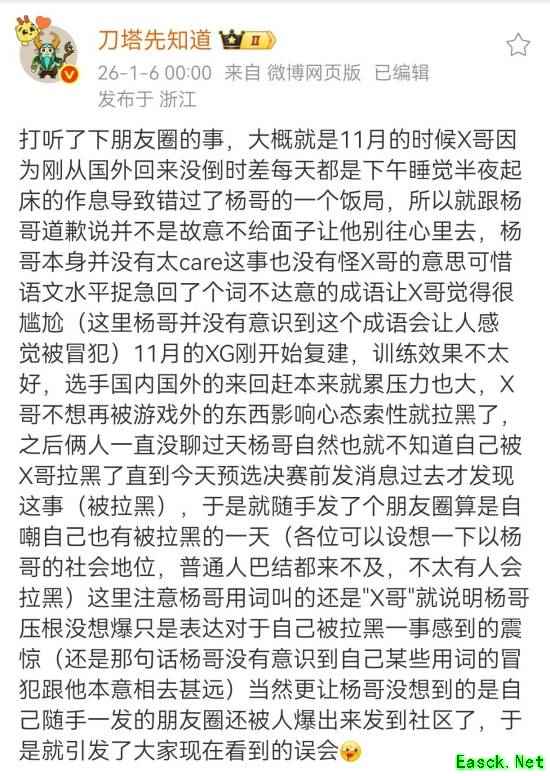 2026年1月,杨一清向选手XXS(林靖)发送微信消息时被拒收,随后反手在朋友圈晒出截图,并配文调侃XXS“毕竟TI亚军嘛”“居功自傲”,此举引发社区广泛讨论。