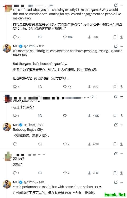 要说到PS5中画面表现最佳的那一款游戏,你通常会认为是哪一部作品?1月6日,推特玩家@nib95_表示:《机械战警:暴戾都市》的画面绝对能说得上非常优秀。
