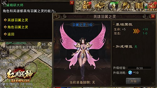 羽翼作为一个新装备,支持交易、强化、宝石镶嵌,羽翼也能大幅强化一波主角和英雄属性。获取方式为在新的NPC“羽翼精研大师”这里使用金刚石抽取,抽羽翼时还会抽到材料,可以用于强化羽翼。羽翼消耗指定材料进行强化,强化等级越高,材料消耗越多,属性加成也越多,同时羽翼之间还可以相互属性转移。不同风格的羽翼外观,在玛法大陆上缤纷呈现。