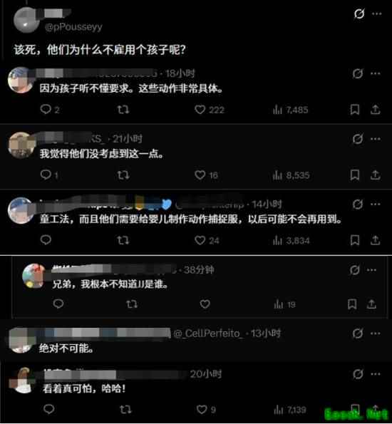 有玩家表示非常震惊,同时好奇顽皮狗为何不直接找真小孩进行拍摄;有人指出,这可能是为了遵守童工法,同时制作婴儿专用的动作捕捉服成本高、使用频率低,因此选择成年演员更为合理;还有玩家分析,婴儿年龄太小,根本听不懂具体动作要求,而成年演员则能精准演绎这些细节。