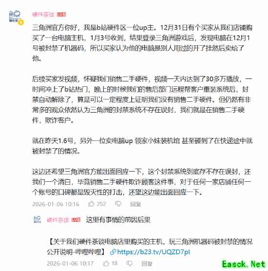 三角洲官方你好,我是b站硬件区一位up主。12月31日有个买家从我们店铺购买了一台电脑主机,1月3号收到,结果登录三角洲游戏后,发现电脑在12月1号被封禁了机器码,所以买家认为他的电脑是别人用过的开了挂然后卖给了他。
