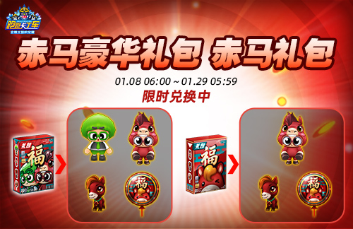 《跑跑卡丁车》2026新年礼包”赤马豪华礼包“、”赤马礼包“现已登场!在1月8日06:00至1月29日05:59期间兑换”赤马豪华礼包“可获得”葱头(无限制)”、“葱头赤马装(无限制)”、“迷你赤马(无限制)”、“赤马气球(30个)”;而在同时段内兑换“赤马礼包”则可获得“葱头赤马装(无限制)”、“迷你赤马(无限制)”、“赤马气球(30个)”~