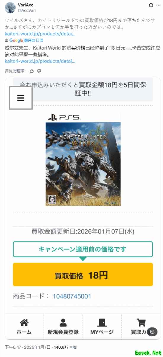 尽管卡普空一直在努力解决玩家对《怪物猎人:荒野》的各种问题,但相比系列前作,本作仍显内容量不足,再加上性能表现不佳(尤其是PC版),仍导致其销量未达预期。虽然它并非一款糟糕的游戏,但其市场口碑已经反映在价格上——日本二手商品店 Kaitori World对PS5实体版《怪物猎人:荒野》的最高回收价,竟然只有18日元(约合人民币8毛)。