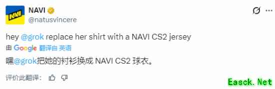 其中甚至不乏一些官方账号参与玩梗。比如,知名电子竞技俱乐部NAVI就直接喊话 Grok:“把她的衣服换成NAVI队服。”