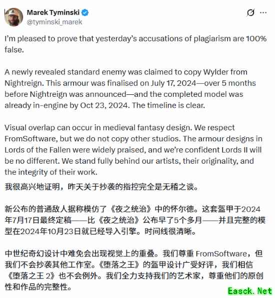面对指责,开发商CI Games的CEO Marek Tyminski今日亲自下场“辟谣”。他发文表示,所谓“抄袭”指控是100%的谎言。
